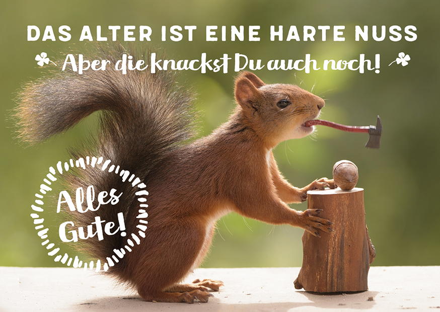 Das Eichhörnchen sitzt auf einem hölzernen Untergrund und malt eine Nuss mit einem Hammer. Es strahlt Lebensfreude aus und vermittelt eine positive Botschaft über das Altern.