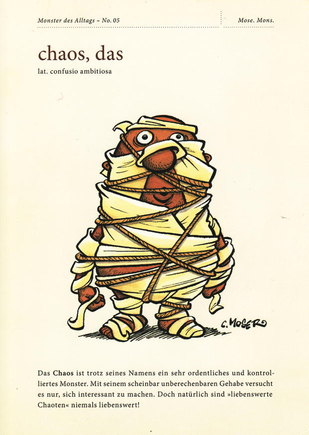 Das Monster mit dem Namen Chaos hält sich ordentlich, während es in Binden gehüllt ist. Es möchte seine Kontrolle über das scheinbare Durcheinander demonstrieren und zieht die Aufmerksamkeit auf sich.