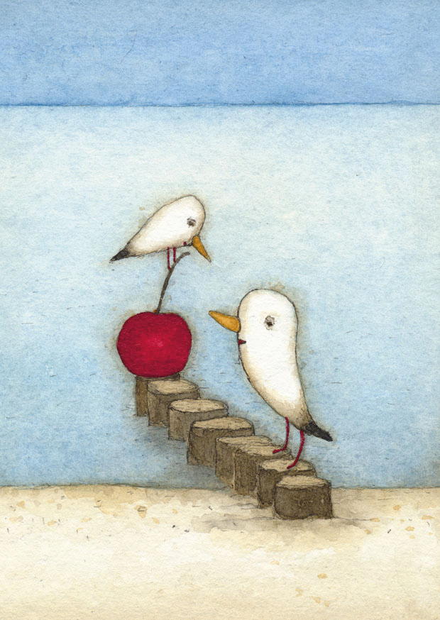 Zwei kleine Vögel befinden sich am Strand und beobachten aufmerksam einen Vogel, der geschickterweise auf einem roten Apfel balanciert, während das Wasser sanft plätschert.