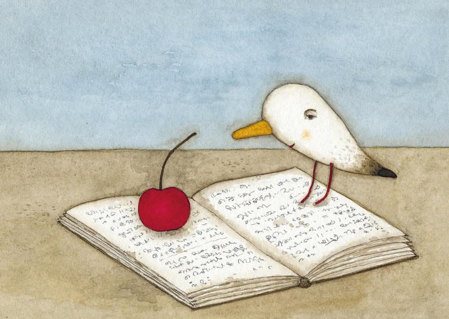 Der kleine Vogel beobachtet mit Aufmerksamkeit eine rote Kirsche neben einem offenen Buch. Es scheint ein friedlicher Moment an einem sonnigen Tag zu sein.