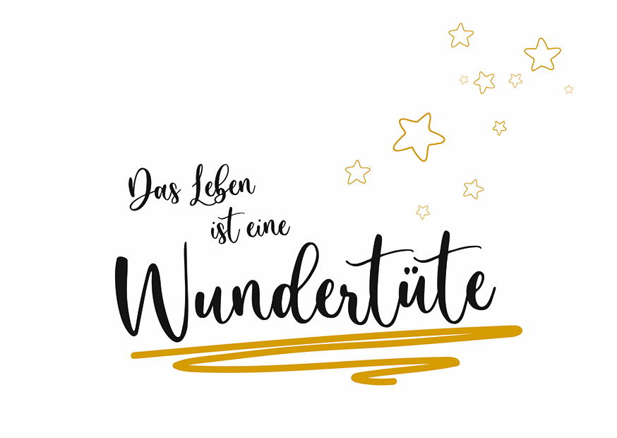 Der Spruch „Das Leben ist eine Wundertüte“ ist künstlerisch gestaltet und wird von stilisierten Sternen begleitet, die für Träume und Möglichkeiten stehen.