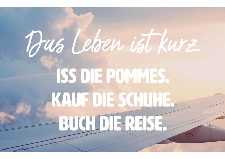 Ein inspirierendes Zitat über das Leben, das zum Handeln anregt. Der Sonnenuntergang beleuchtet den Flugzeugflügel und schafft eine positive Atmosphäre.