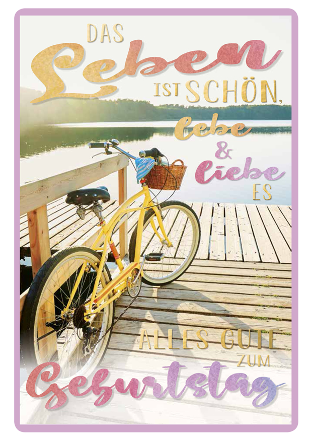 Ein gelbes Fahrrad steht auf einer Holzterrasse am Wasser. Bunte Schriftzüge wünschen alles Gute zum Geburtstag und vermitteln Lebensfreude und Glück.
