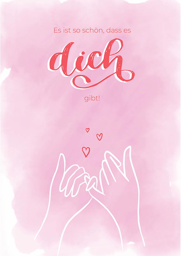 Zwei Hände formen ein Herz und drücken eine liebevolle Botschaft aus, dass es schön ist, dass du existierst. Der Hintergrund ist in sanften Rosatönen gehalten.