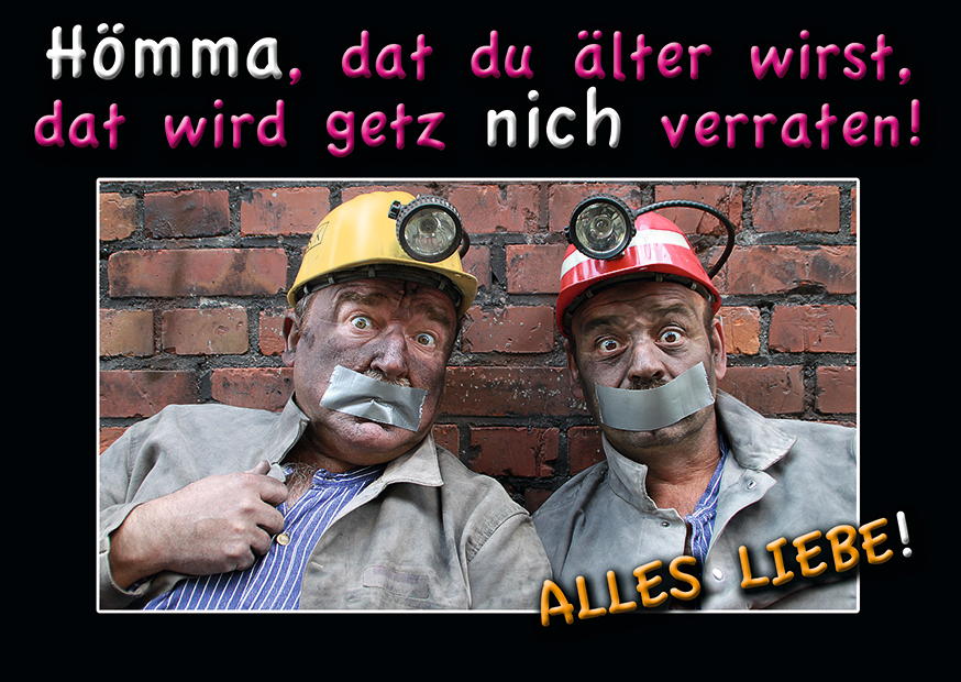 Zwei Bergleute, mit schmutzigen Gesichtern und Helmen, schauen mit einem humorvollen Gesichtsausdruck zur Kamera, ihre Münder sind mit Klebeband verschlossen.