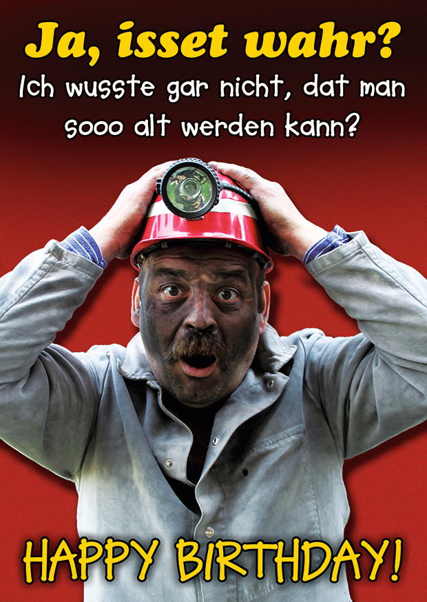 Ein überraschter Mann mit einem Sicherheitshelm zeigt seine Verwunderung über das Altwerden. Sein ausdrucksvolles Gesicht vermittelt Freude und Überraschung bei einer Geburtstagsfeier.