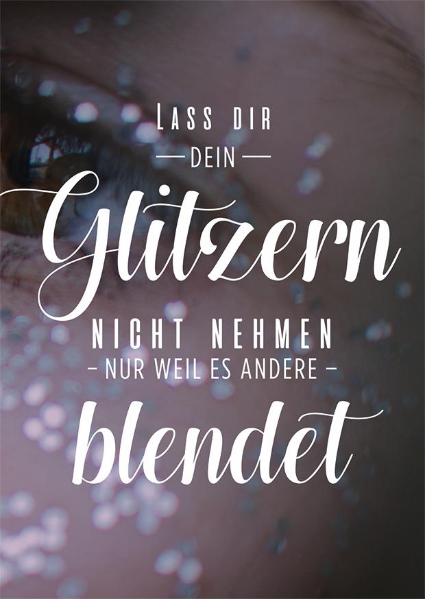 Ein Zitat ermutigt dazu, das eigene Strahlen zu bewahren, trotz der Ablenkungen von außen. Das Glitzern symbolisiert inneren Glanz und Selbstvertrauen.