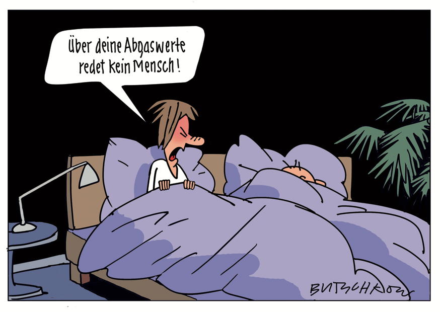Eine Person liegt schlafend im Bett, während die andere aufrecht sitzt und ärgerlich über Abgaswerte spricht. Die Szenerie ist nächtlich und gemütlich gestaltet.