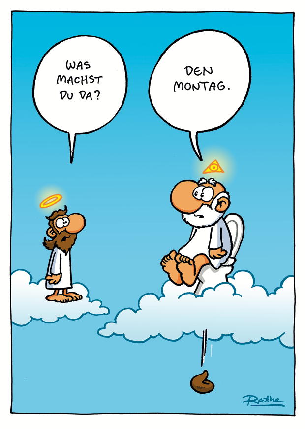 Zwei himmlische Figuren unterhalten sich über den Montag, während sie auf einer Wolke in einem klaren blauen Himmel sitzen. Eine amüsante Situation entsteht.