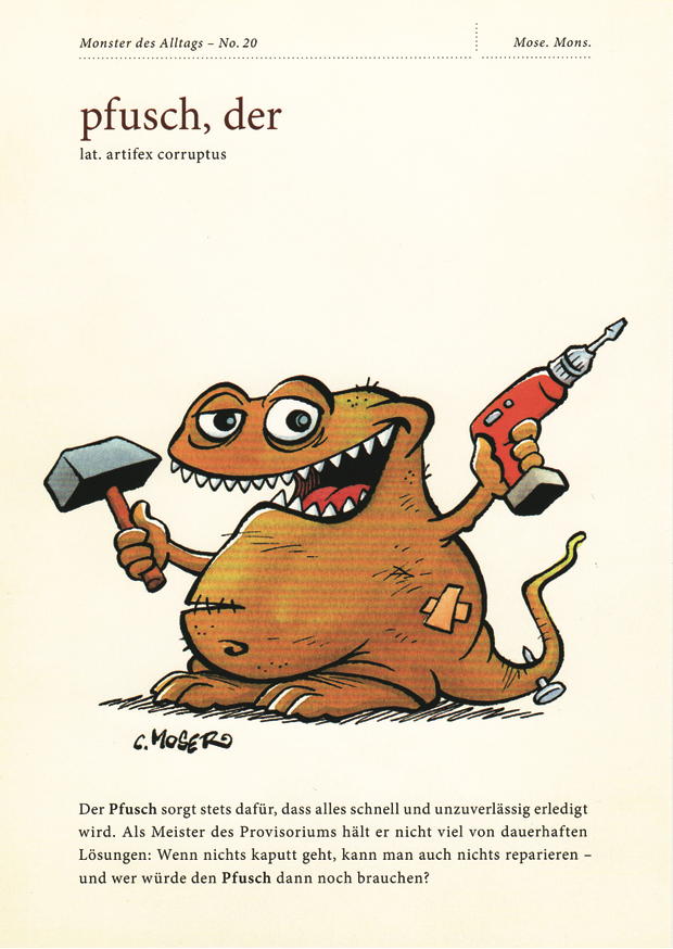 Das Pfusch-Monster arbeitet geschäftig mit einem Werkzeug in der Hand und bietet seine Hilfe bei Reparaturen an, während es seine charmante Persönlichkeit zeigt.