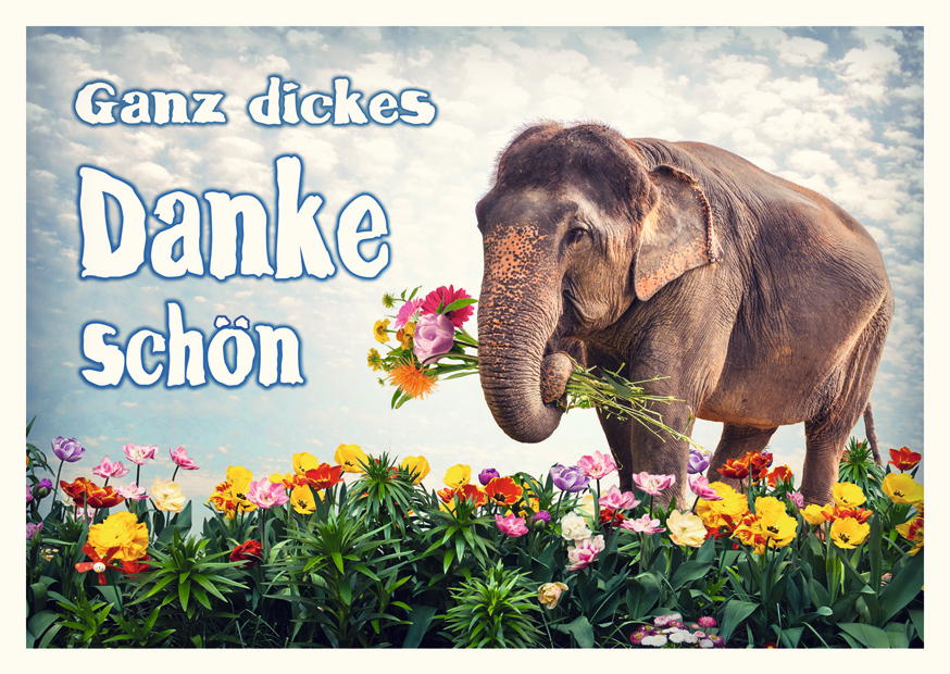 Ein fröhlicher Elefant steht in einer farbenfrohen Blumenwiese und hält eine Blumenstrauß im Mund. Der Himmel ist klar und die Stimmung ist optimistisch.