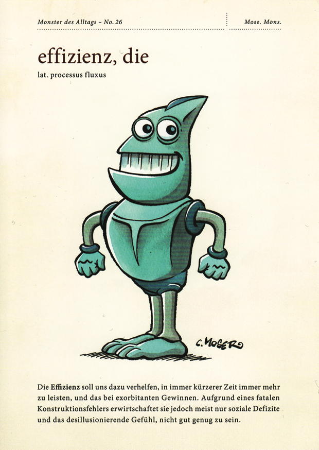 Der Charakter mit einem metallischen Aussehen symbolisiert Effizienz und steht auf einem Blatt mit dem Titel Effizienz, die. Der Kontext reflektiert soziale Defizite.