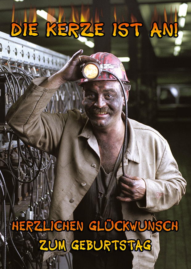 Ein Bergmann mit einer Stirnlampe und schmutzigem Gesicht lächelt jubelnd, während er seine Kerze zum Geburtstag präsentiert, umgeben von Bergbauausrüstung.