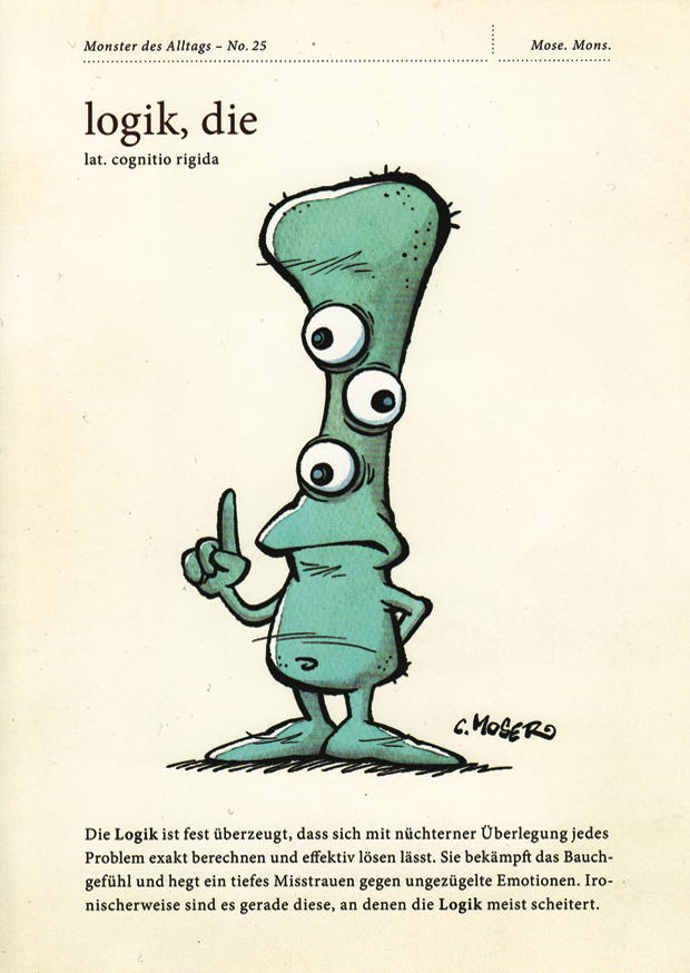 Ein lustiges Monster mit grüner Haut und großen Augen steht in einem alten Buch. Es erklärt auf witzige Weise das Konzept der Logik und ihre Eigenschaften.