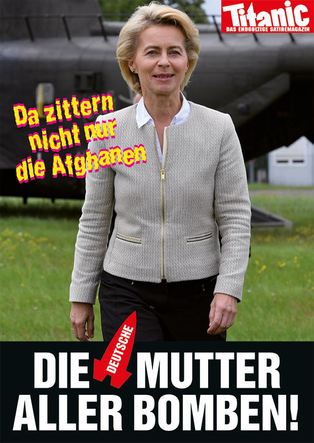 Die Frau steht souverän vor einem Militärflugzeug und strahlt Selbstbewusstsein aus. Die Situation wirkt sowohl ernst als auch humorvoll, die Botschaft ist provokant.