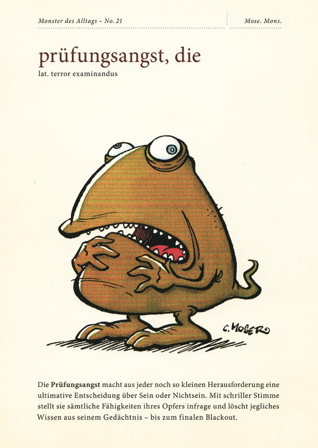 Das Wesen drückt die Furcht vor Prüfungen aus, während es nervös die Hände um seinen Bauch hält. Diese Darstellung veranschaulicht das Gefühl der Prüfungspanik.