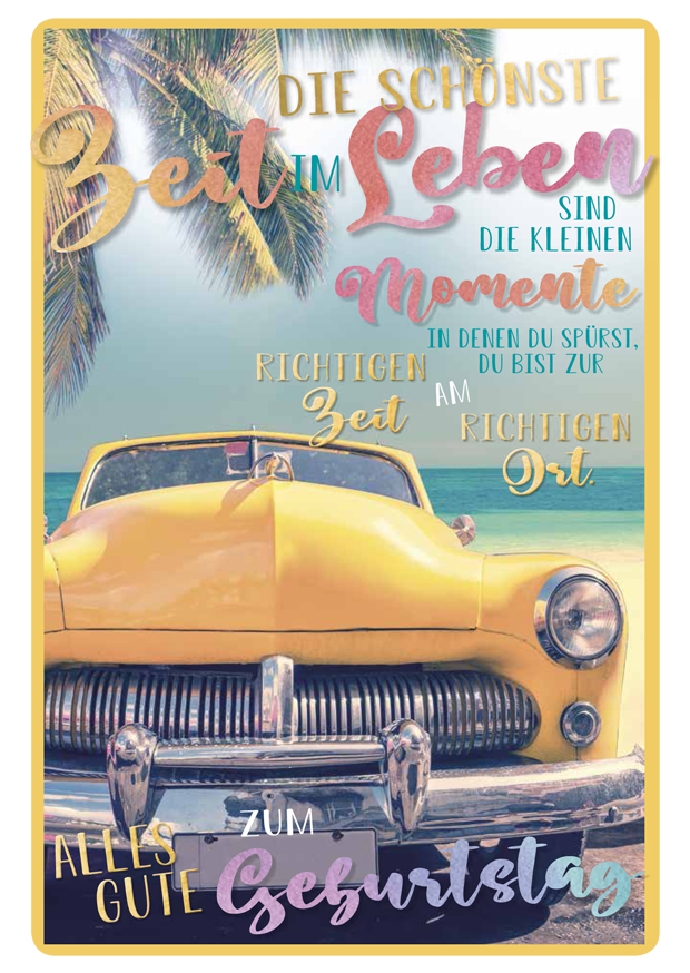 Diese Karte vermittelt die Freude am Leben und erinnert an wunderbare Momente. Ein Oldtimer steht vor einem tropischen Hintergrund, ideal für Geburtstagswünsche.