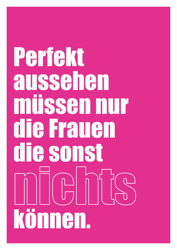 Die auffällige Grafik vermittelt eine klare Botschaft über den Druck auf Frauen, perfekt auszusehen, während ihre Fähigkeiten oft nicht anerkannt werden.