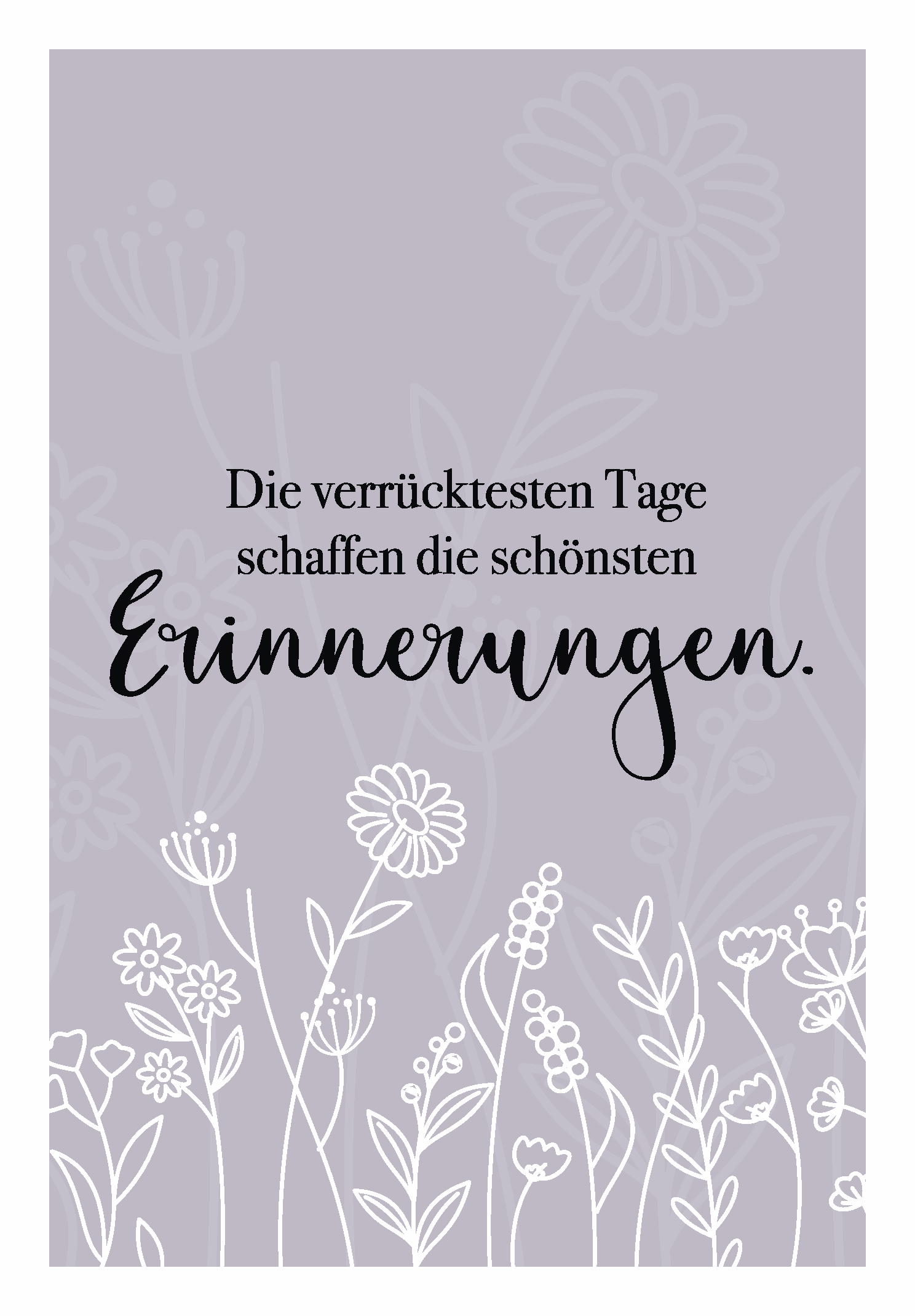 Auf einem sanften, lilafarbenen Hintergrund befindet sich eine florale Gestaltung mit dem Zitat, dass die verrücktesten Tage die besten Erinnerungen schaffen.