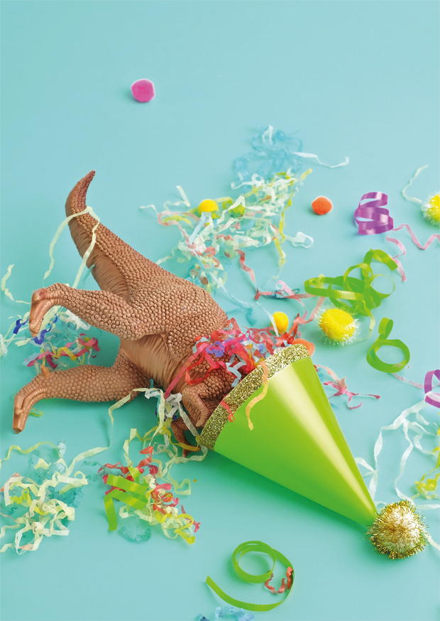Ein Spielzeug-Dinosaurier liegt mit einem bunten Partyhut und umgeben von Konfetti und Luftschlangen auf einer leuchtend blauen Oberfläche. Die festliche Stimmung ist deutlich zu spüren.