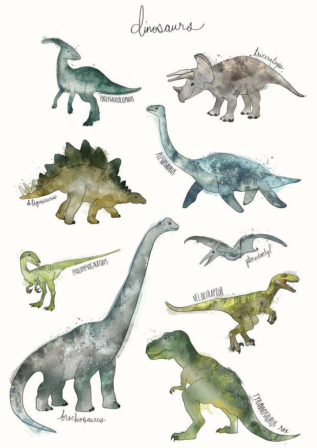 Eine kreative Darstellung von Dinosauriern in sanften Wasserfarben, die verschiedene Arten zeigt, darunter Triceratops, Tyrannosaurus und andere.