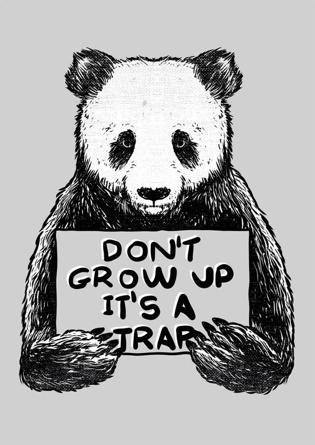 Ein niedlicher Panda hält ein Schild, auf dem steht, dass es eine Falle ist, erwachsen zu werden. Die Darstellung ist humorvoll und regt zur eigenen Reflexion an.