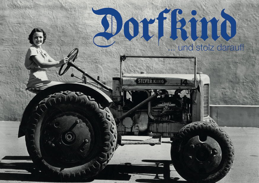 Ein junger Mensch in einem Kleid sitzt auf einem alten Traktor und lächelt in die Kamera, neben einer schlichten Wand in einem Dorf. Die Szene strahlt Freude aus.
