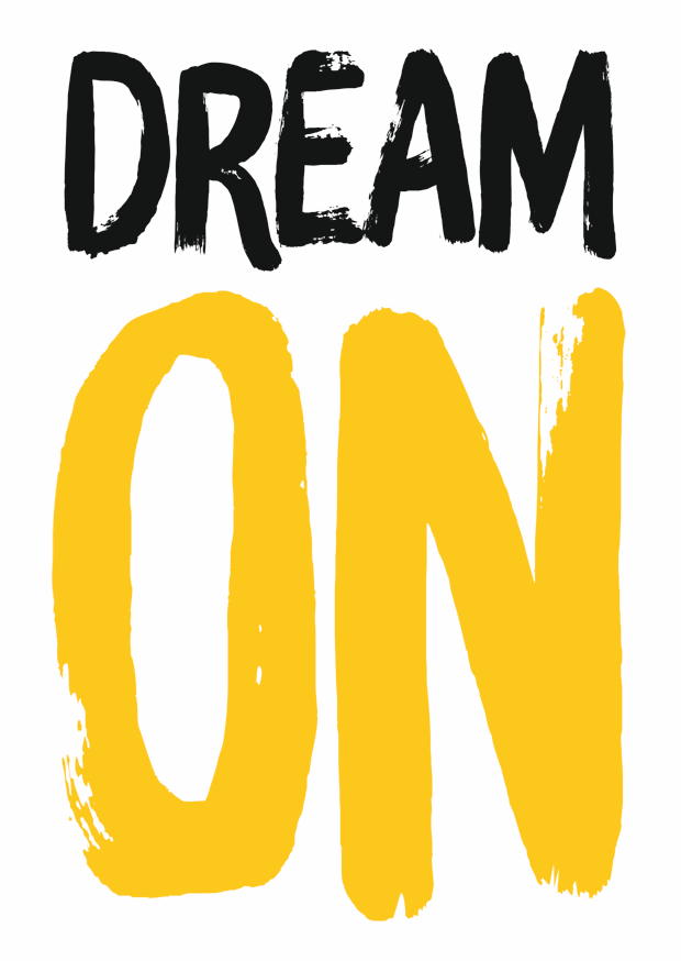 Der Schriftzug Dream On in großen, kräftigen Buchstaben steht im Vordergrund und ermutigt dazu, weiter zu träumen und an seine Ziele zu glauben.