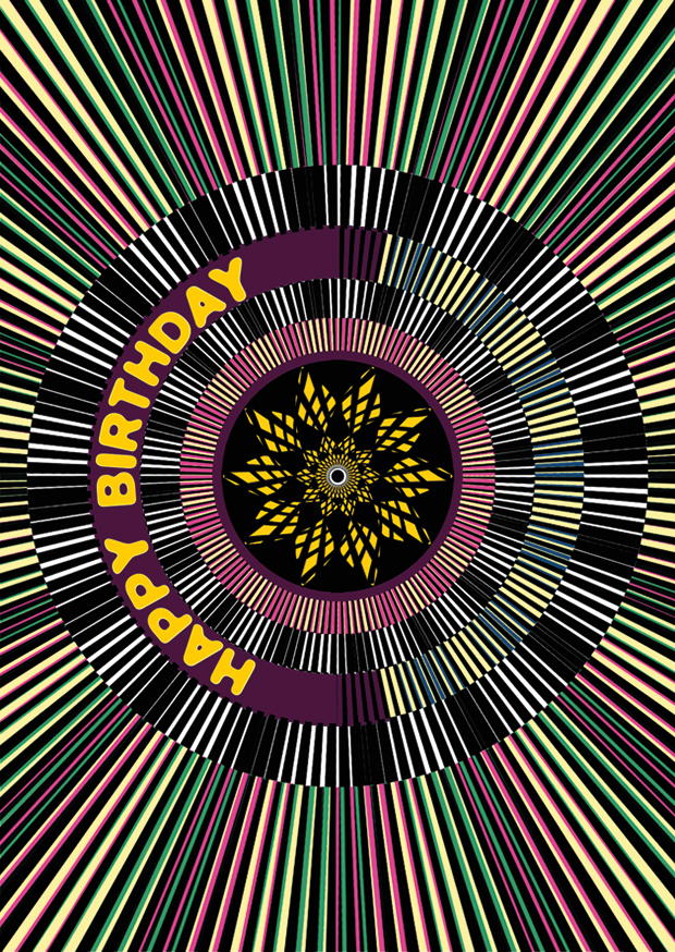 Eine festliche Geburtstagskarte, die mit lebhaften Farben und strahlenden Linien gestaltet ist. Der Text Happy Birthday ist zentral platziert und verleiht der Karte eine fröhliche Ausstrahlung.