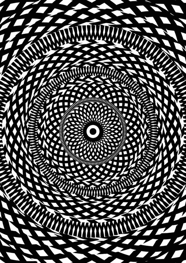Das Bild zeigt ein komplexes Muster in Schwarz und Weiß, das spiralförmige Elemente umfasst und eine hypnotisierende Bewegung sowie eine harmonische Symmetrie vermittelt.