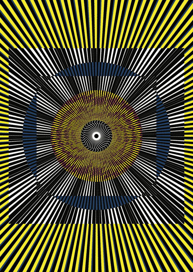 Das Bild zeigt ein faszinierendes geometrisches Muster, das mit intensiven Farben arbeitet und den Betrachter in eine hypnotische Optik eintauchen lässt, besonders durch den kreisförmigen Mittelpunkt.