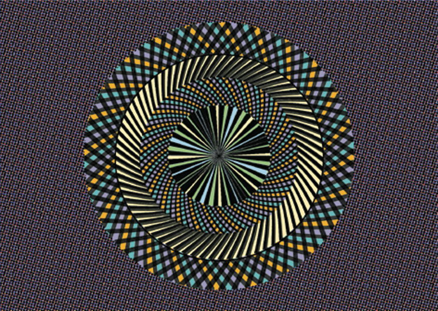 Ein faszinierendes, kreisförmiges Muster zeigt komplexe geometrische Formen in verschiedenen Farben. Die Kontraste und Linien erzeugen eine hypnotisierende Wirkung.