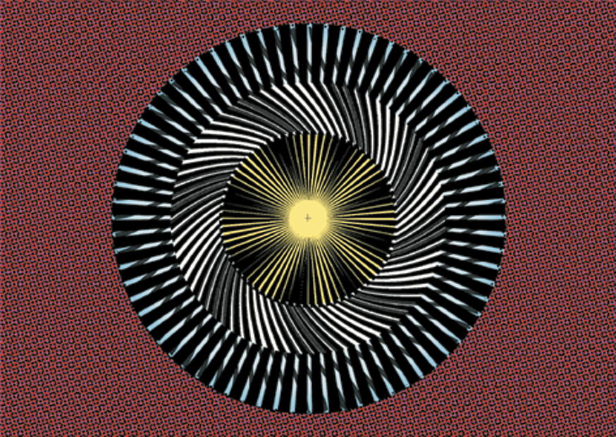 Die Komposition zeigt eine auffällige kreisförmige Anordnung mit gelben Elementen in der Mitte, umgeben von harmonischen Linien, die sich spiralförmig anordnen.