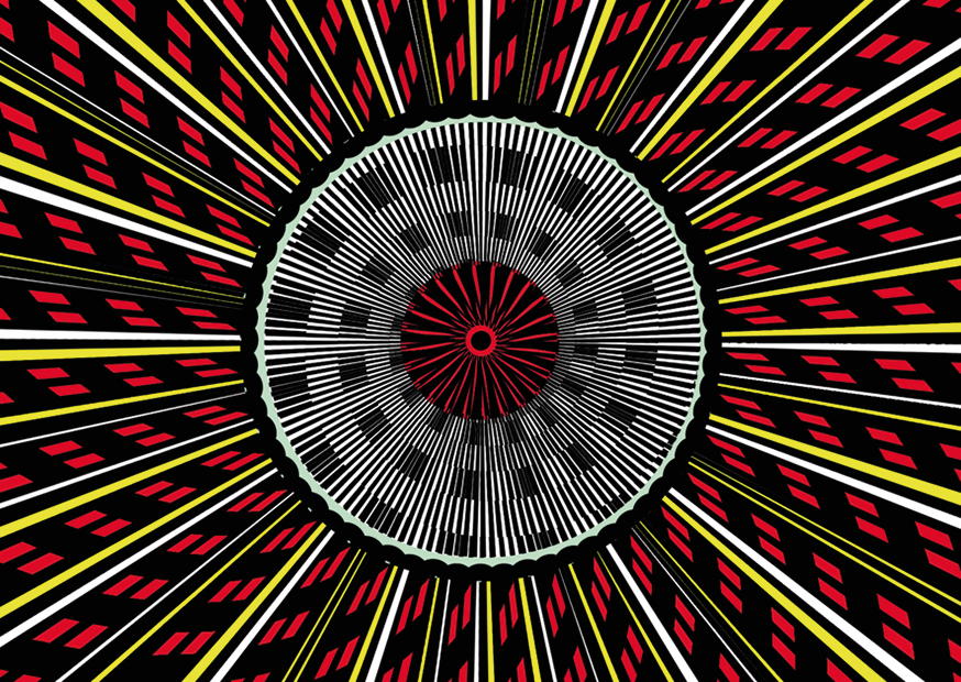 Ein farbenfrohes Kunstwerk zeigt eine Vielzahl von sich ausbreitenden Linien in Schwarz, Rot und Gelb, die eine faszinierende und hypnotisierende Wirkung erzeugen.