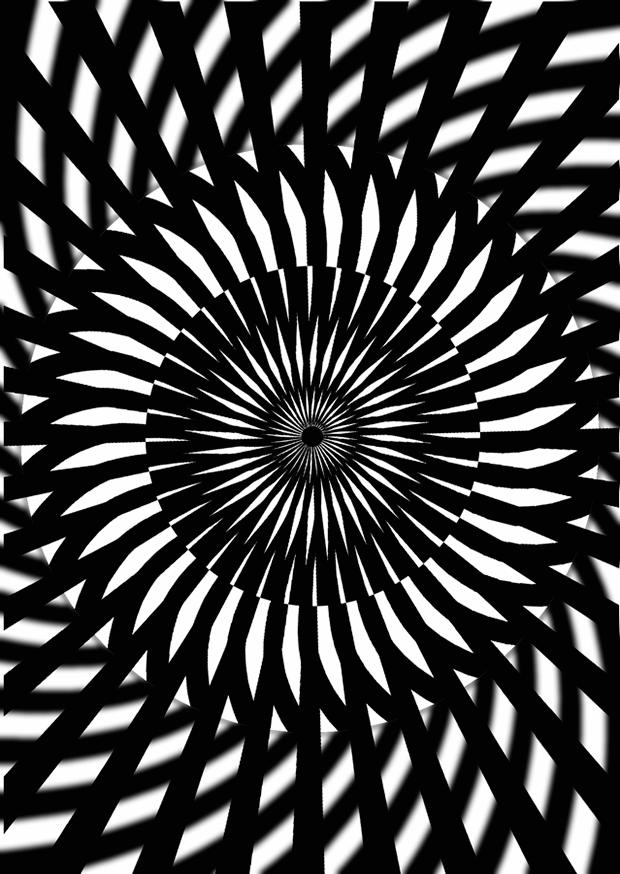 Ein faszinierendes Kunstwerk zeigt komplexe Schwarz-Weiß-Muster, die eine hypnotisierende spiralförmige Bewegung erzeugen und die Aufmerksamkeit auf sich ziehen.