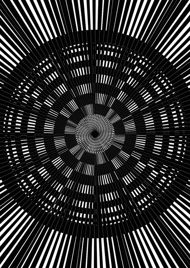Ein faszinierendes spiralförmiges Muster aus kontrastierenden schwarzen und weißen Linien erzeugt eine optische Illusion im minimalistischen Stil.