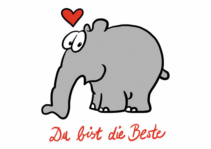 Ein fröhlicher, cartoonartiger Elefant mit einem großen Herzen zeigt seine Zuneigung. Unter ihm steht die liebevolle Botschaft, die Wertschätzung ausdrückt.