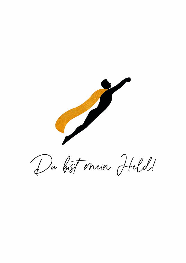Ein kreatives Design zeigt eine Silhouette eines Helden mit Umhang. Die Darstellung vermittelt Mut und Inspiration, Ideal für Anerkennung und Dankbarkeit.