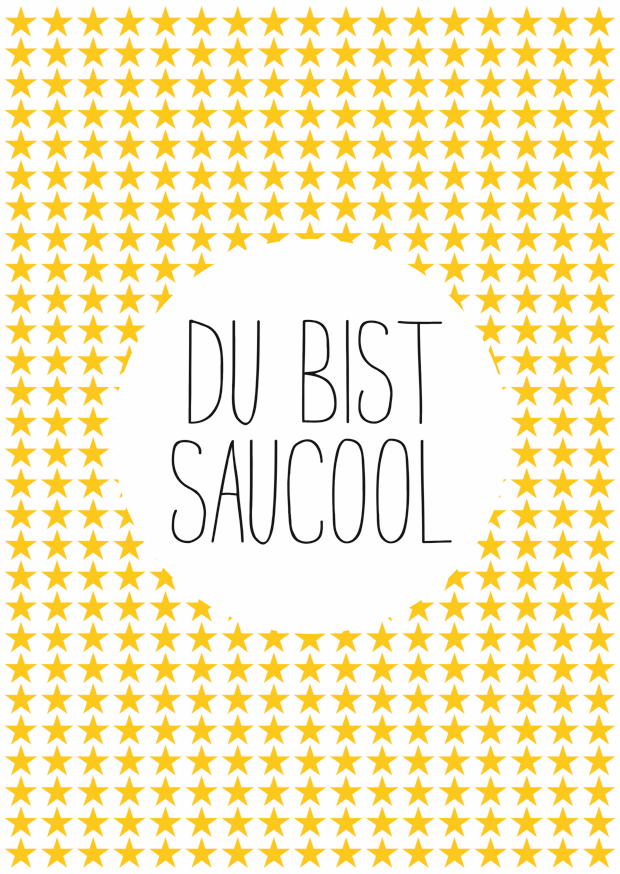Das bunte Poster zeigt den motivierenden Spruch „Du bist saucool“ in einem kreisförmigen weißen Bereich, umgeben von vielen gelben Sternen. Es strahlt Freude aus.