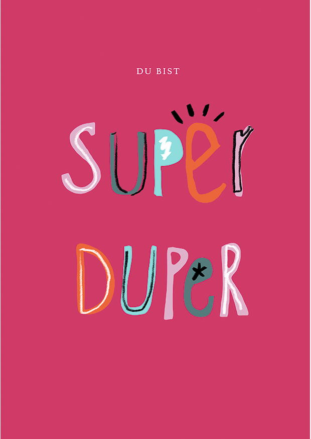 Die Grafik zeigt in fröhlichen Farben den Spruch „Du bist super duper“ auf einem pinken Hintergrund. Sie strahlt eine positive Energie und Selbstbewusstsein aus.