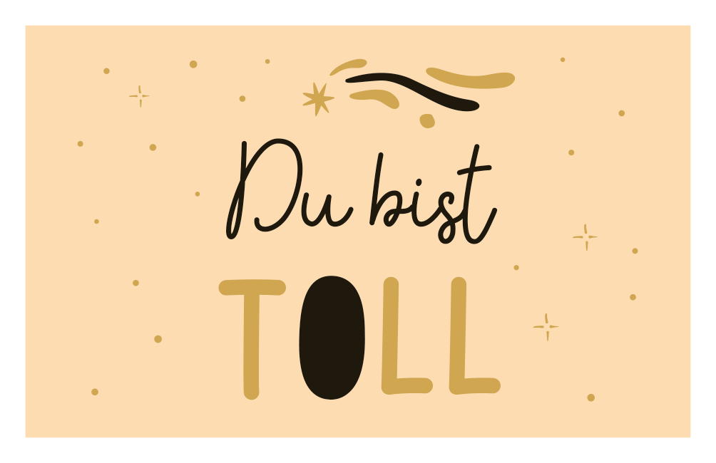 Der Schriftzug „Du bist toll“ steht auf einem hellbeigen Hintergrund und wird von goldenen Sternen umrahmt, was eine freundliche und motivierende Botschaft vermittelt.