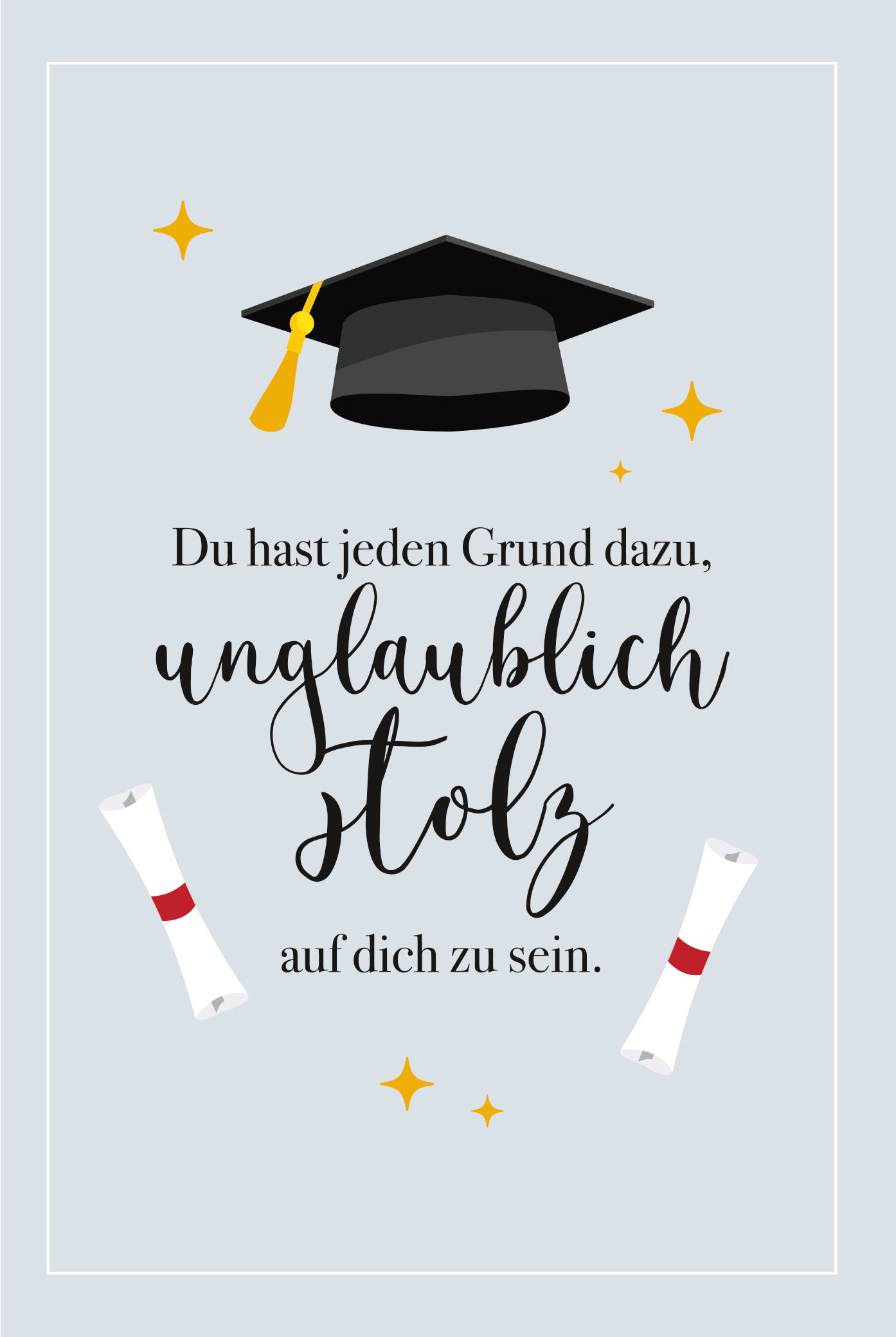 Der elegante Abschlusstext ermutigt dazu, stolz auf die eigenen Leistungen zu sein, mit einer Graduation-Mütze und Diplomen im Hintergrund.