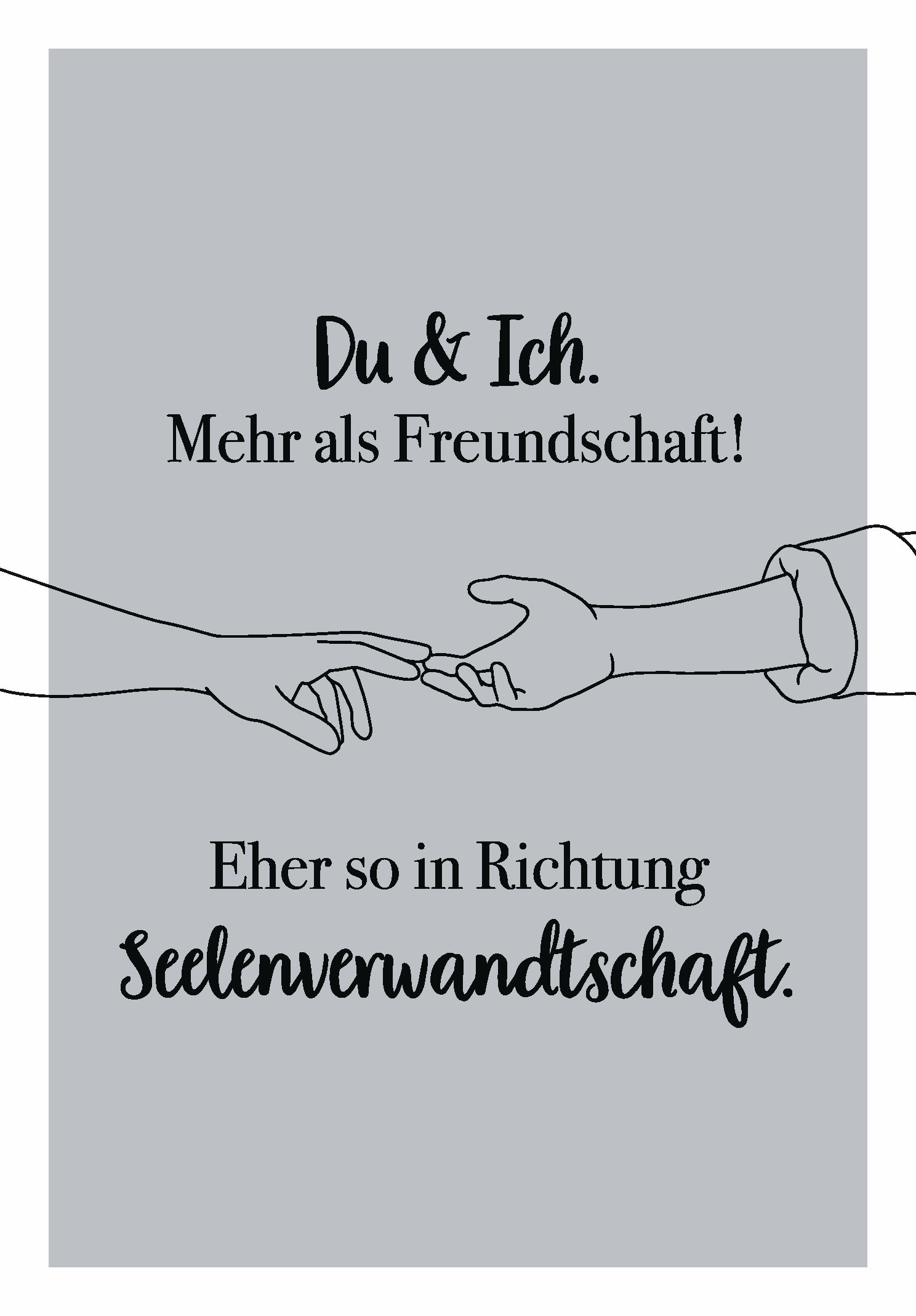 Zwei Hände sind in einer zarten Berührung dargestellt, was die enge Beziehung zwischen den beiden Menschen symbolisiert. Die Worte deuten auf eine tiefere Verbindung hin.