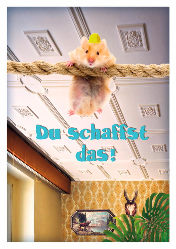 Der Hamster hängt mit einer Schnur von der Decke und trägt einen kleinen Hut. Die Umgebung ist eine gemütliche, nostalgische Wohnstube mit alten Tapeten.