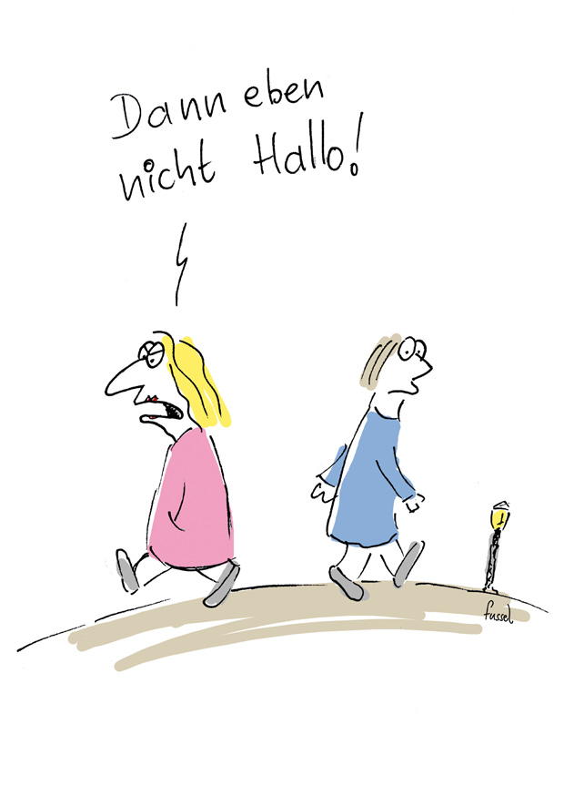 Zwei Frauen gehen in entgegengesetzte Richtungen, während eine sich ärgert und die andere gelassen bleibt. Unbeholfenes Schweigen und Missverständnisse im Alltag.