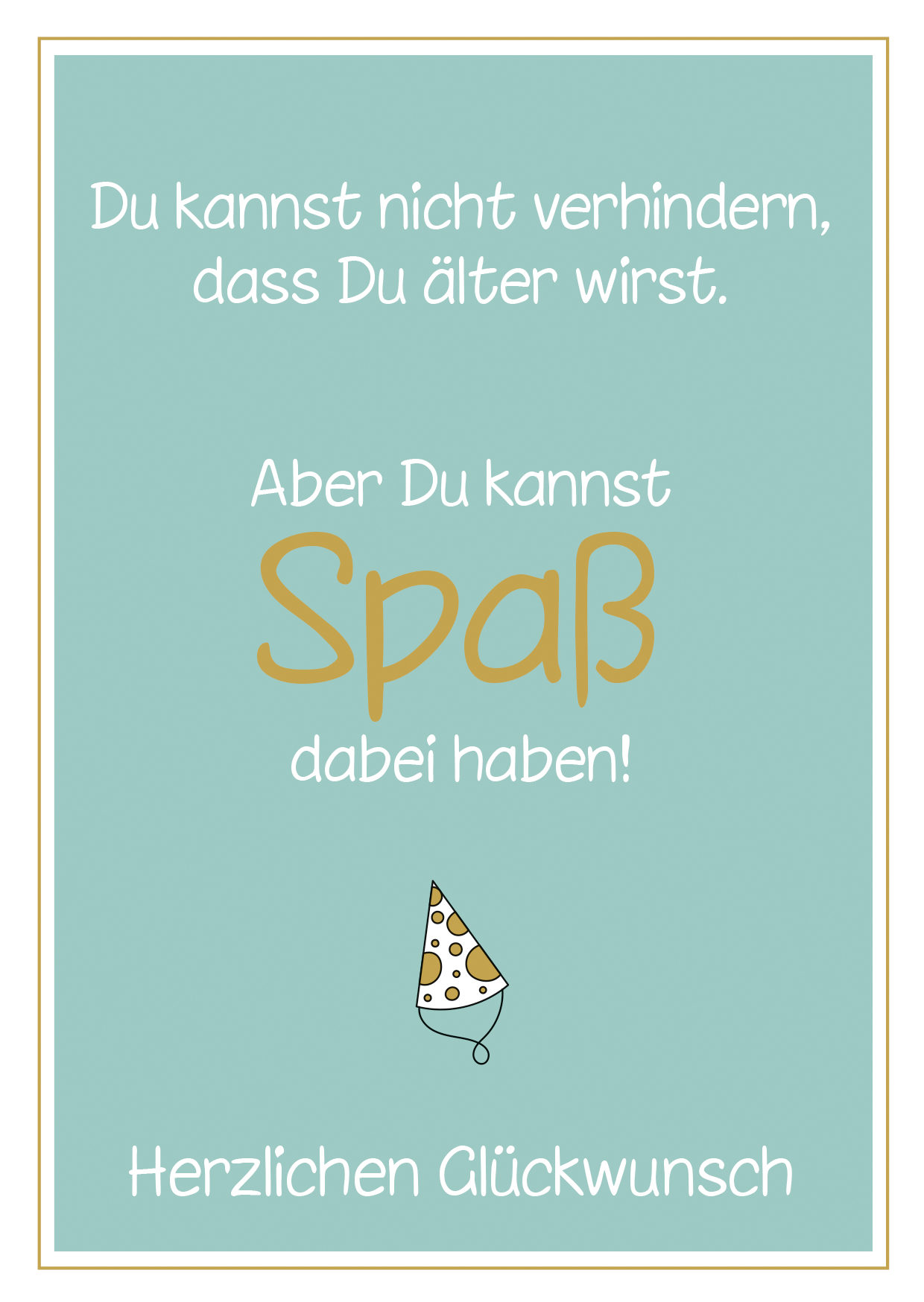 Ein fröhlicher Geburtstagsgratulationsspruch, der humorvoll auf das Älterwerden hinweist und dazu ermutigt, Spaß zu haben. Mit buntem Design und Partyhut.