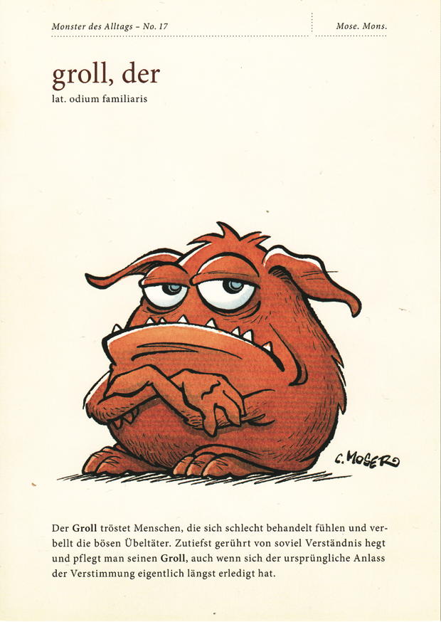 Das Monster mit einem missmutigen Ausdruck zeigt, wie es Menschen tröstet, die von anderen schlecht behandelt werden. Der Groll wird humorvoll dargestellt.