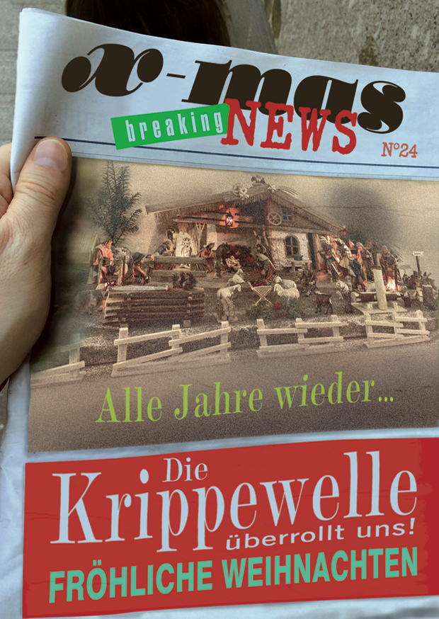Eine Hand hält eine Zeitung mit dem Titel "Krippenwelle überrollt uns". Der Text kündigt die bevorstehenden Festlichkeiten und Bräuche an.