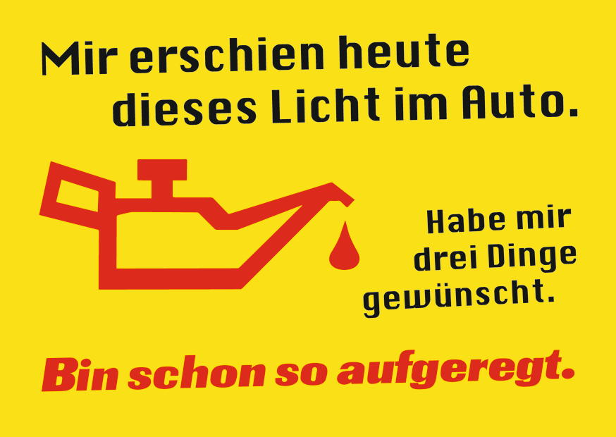 Im Auto leuchtet die Ölwarnleuchte rot auf. Der Fahrer äußert seine Aufregung und seine Wünschen bezüglich des Problems, das gelöst werden muss.