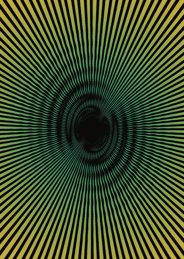 Das Bild zeigt ein interesantes Muster aus sich kreuzenden Streifen und konzentrischen Kreisen, das eine hypnotische Wirkung ausübt und in dunklem Raum eindrucksvoll wirkt.